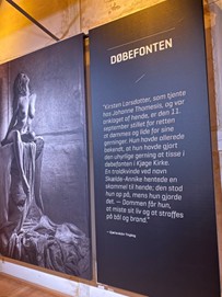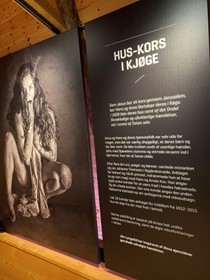 På væggen bag ved trappen hænger et billede af en kvinde med opspilede øjne og en hånd i munden. Halvt levende, halv AI-genereret. Det føles pludselig, som om hun kigger tilbage. Vi træder forsigtigt nærmere, næsten som om vi kan træde forkert og vække noget samfundet har prøvet at tie i århundreder. Vi følger Anna Bartkær fodspor, mens historierne om hekseprocessen i Køge langsomt folder sig ud. 16 kvinder anklaget for trolddom, kun én overlever. Rundt omkring os ligger det absurde og det grusomme side om side — en seng, som de torturerede kvinder vred sig i og en døbefont, som en af de anklagede tissede i.