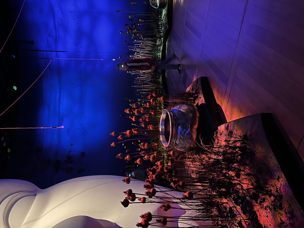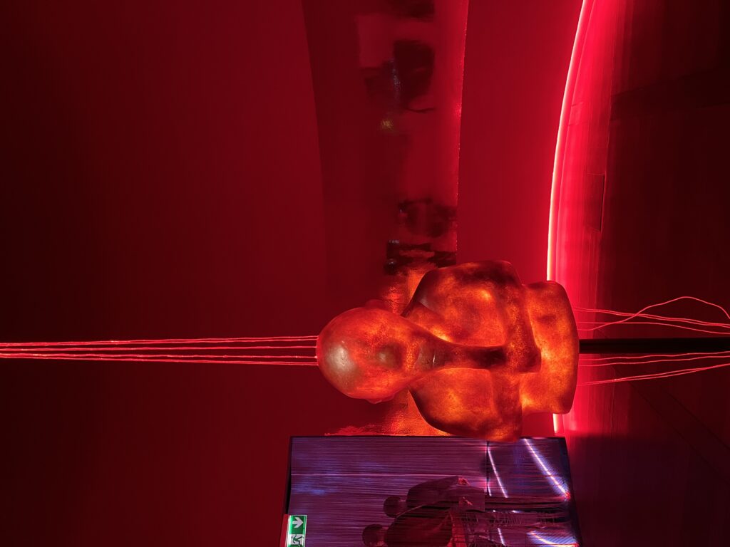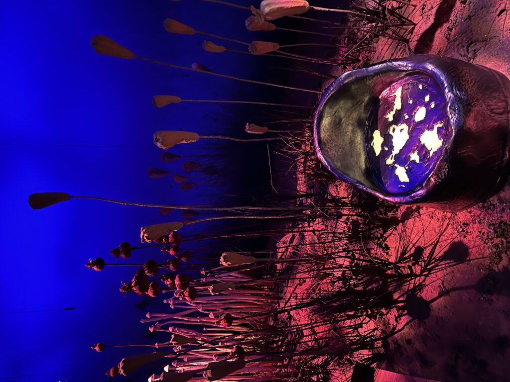 Men i stedet for de klassiske vikingeudstillinger, som vi før har oplevet, forventer vi i dag at opleve en anderledes udstilling. Måske endda en anden fortælling. Hvem er Vølven og hvad vil denne udstilling fortælle os? Vi finder vej op ad trappen til udstillingens indgang, hvor vi bliver mødt af to venlige museumsvagter, der udleverer et sæt høretelefoner til os hver og beder os om at følge instrukserne fra høretelefonerne. Vi stimler sammen foran udstillingens indgang. Det er som om man bliver helt frataget sin egen vilje eller evne til at gøre noget selv, med de her høretelefoner på? Vi lytter og adlyder. Én efter én går vi ind gennem åbningen og følger det som stemmen i høretelefonen siger. Vi kommer ind i et mørkt rum med et stort hvidt ansigt foran os. Er det Vølvens ansigt? Rundt om står høje planter i bede og blandt dem store kar med skinnende substanser. Man må gerne røre – det siger stemmen i vores ører i hvert fald. Den stiller også mange spørgsmål: “Hvad vil du mig, menneske?” og “Vil du vide mere?”. Stemmen guider os videre ind i det næste rum og her skal vi åbenbart opleve Ragnarok. Det er som at stå inde i kernen på en planet, et krigsunivers med ild, lava, lænker og sværd overalt omkring os. Historien om verdens undergang, genoprettelse og nyfundne balance udspiller sig omkring os.